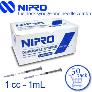 Dispensed as a pack of 50 individually packaged, sterile luer lock syringes and 50 individually packaged, sterile hypodermic needles.